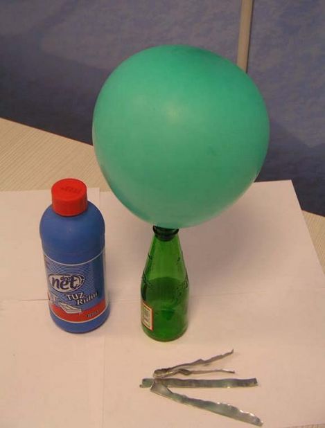 Cam şişe içerisine şekilde görüldüğü gibi malzemeler bir miktar konur ve şişenin ağzına balon kapatılarak balonun durumu gözlemlenir.Bu deney bize Kimyasal tepkimeler , gazların yoğunlukları hakkında bilgiler verebilir.